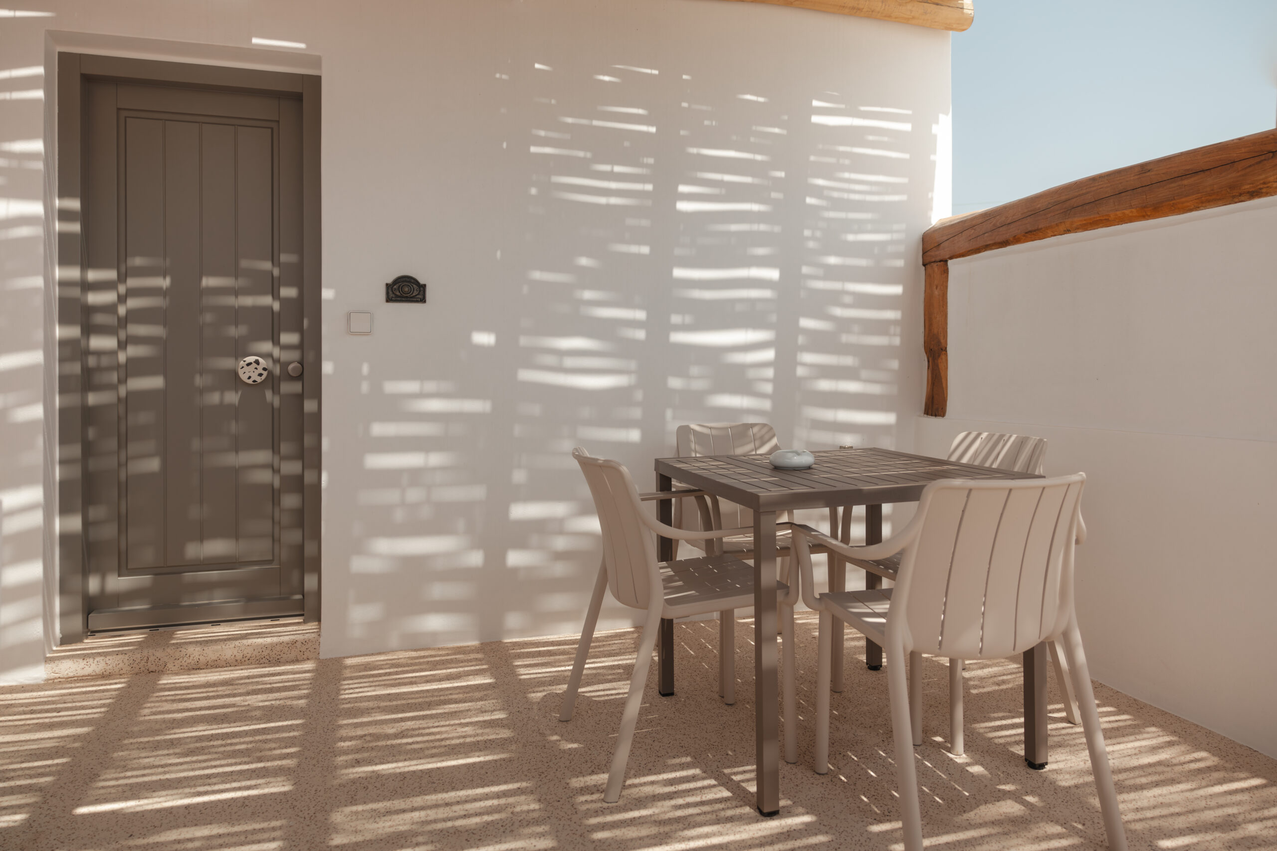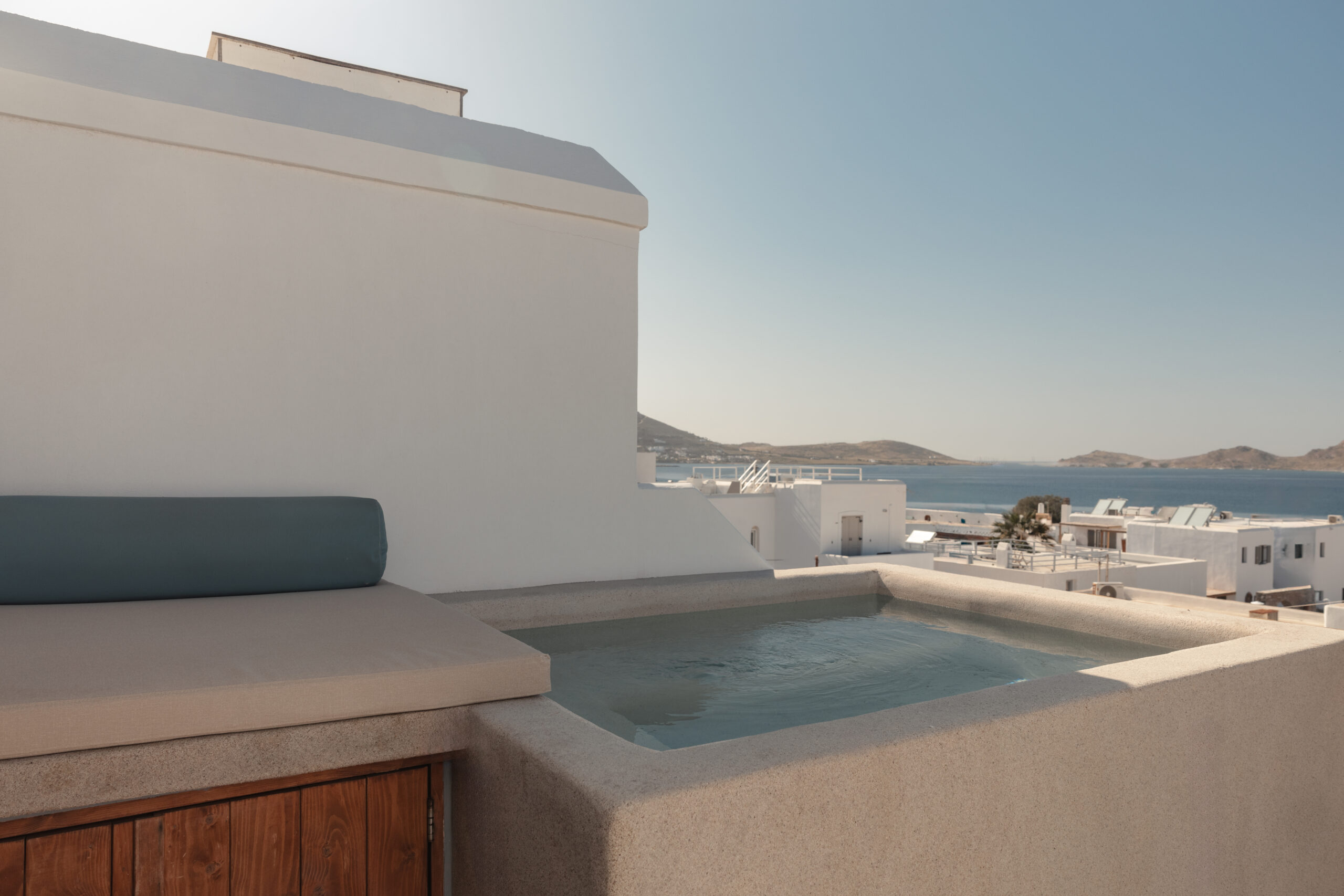 The Elevated Terrace The crown jewel of Castelis is its expansive private terrace. This first-floor sanctuary features its own private plunge pool (approx. 6 sq.m.), where you can soak while gazing at the unobstructed blue of the Aegean. Whether it’s your morning coffee as the island wakes up or a sunset cocktail, this terrace offers a breathtaking, front-row seat to the beauty of the Greek summer.